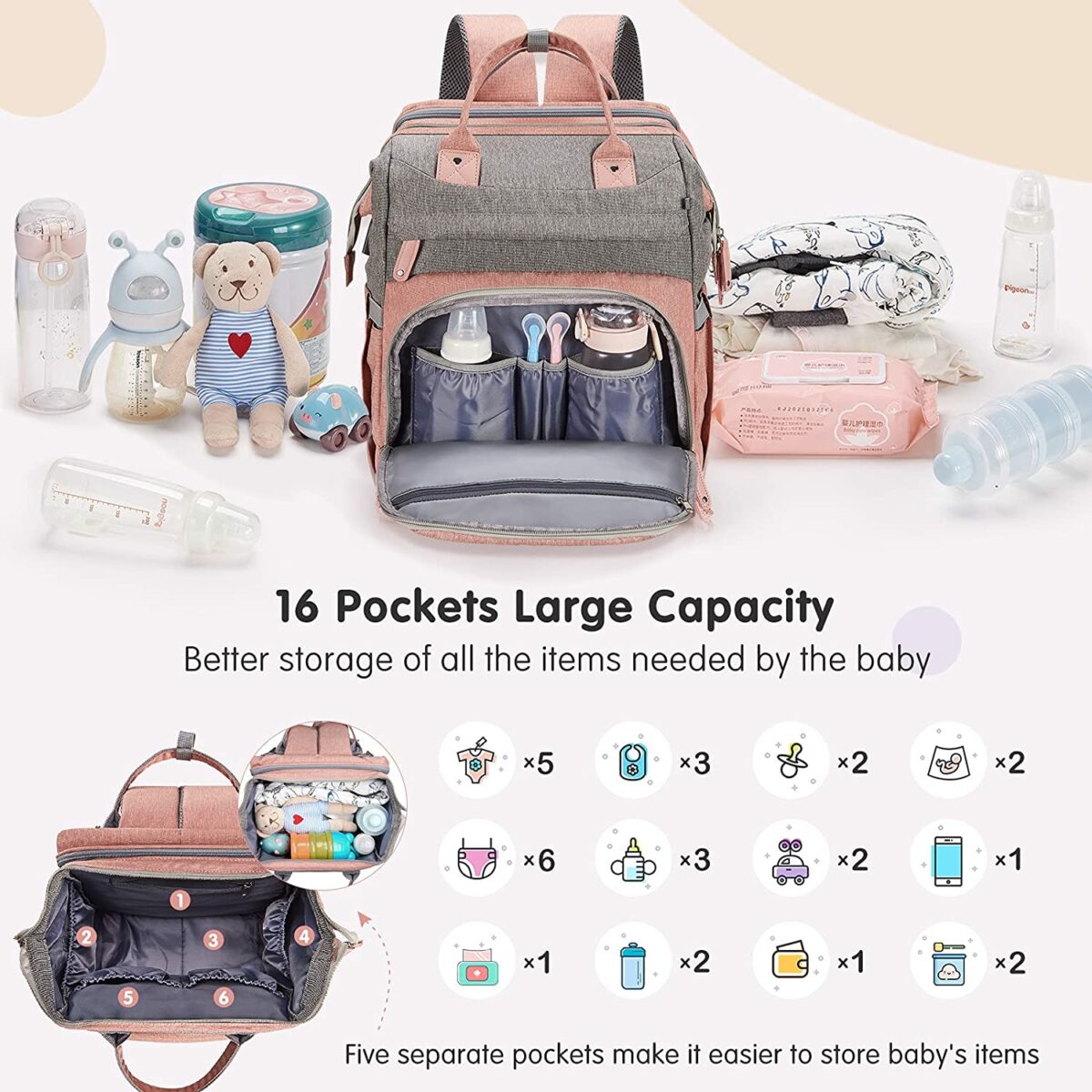 - Голям капацитет – множество отделения за организиране на бебешки и лични вещи