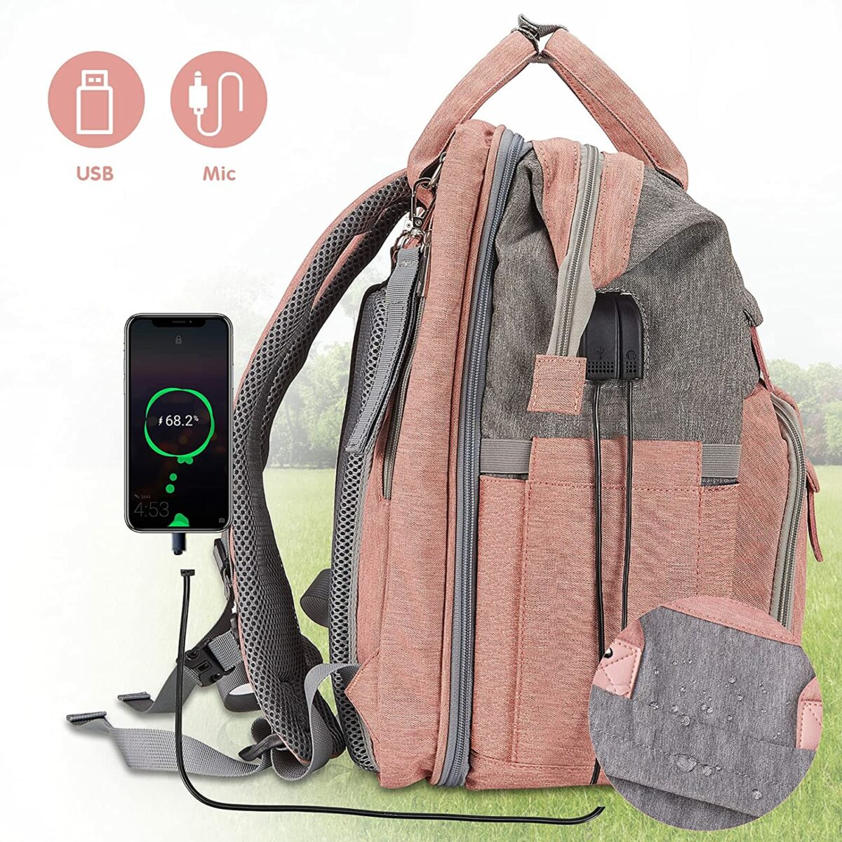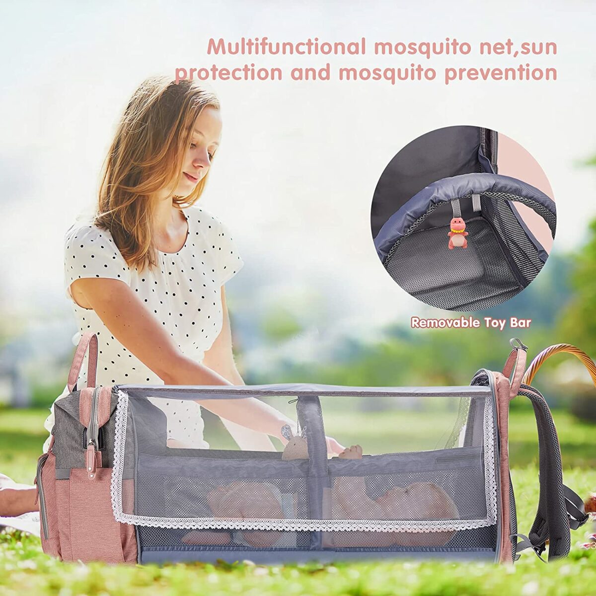 - All-in-one дизайн – включва раница, подложка за повиване, калъф за биберон и ремъци за количка